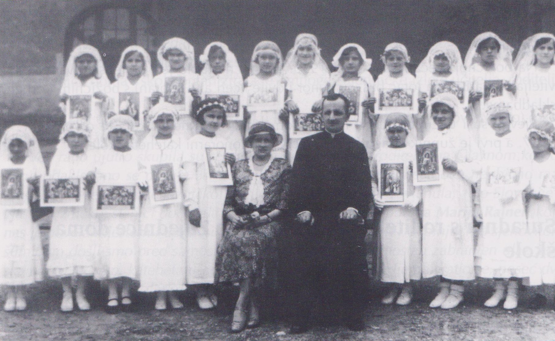 Učenice 2.a razreda s upraviteljicom Alojzijom Vinski i vjeroučiteljem Antunom Sivončikom: