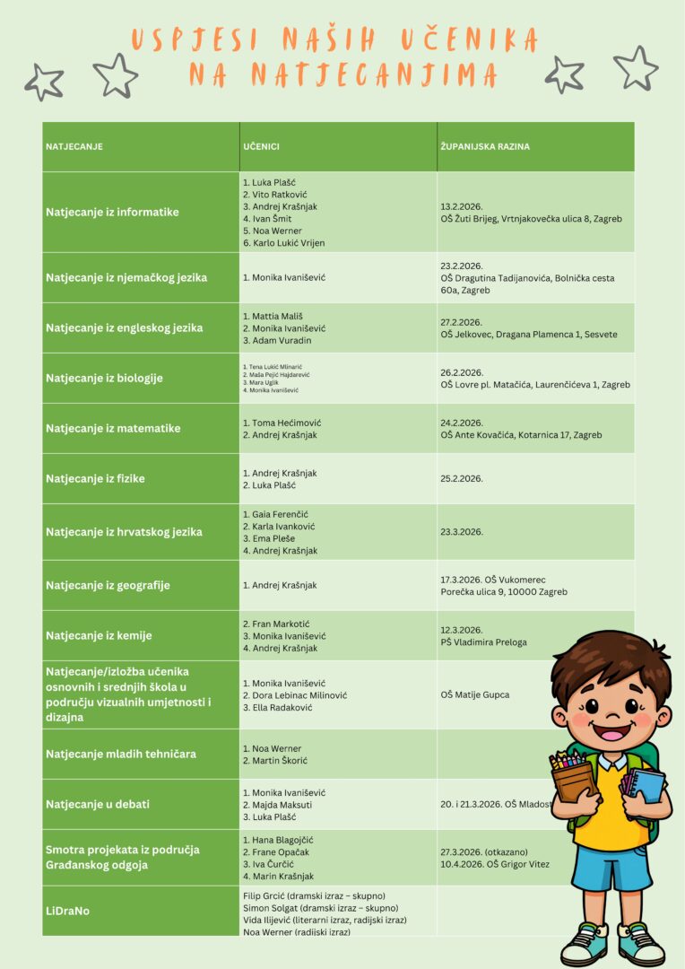U petak i subotu, 20. i 21.3. 2026. u OŠ Mladost, održano je županijsko natjecanje u debati. Našu školu uspješno su predstavljali učenici Monika Ivanišević, Majda Maksuti i Luka Plašč. U ekipnom poretku naša škola zauzela je odlično 4. mjesto. U individualnom poretku...